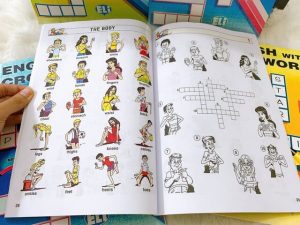 Người học sẽ đọc gợi ý, tìm từ phù hợp và điền vào ô chữ ngang hoặc dọc. Một số bài có kèm tranh minh họa để tăng tính trực quan. Bên cạnh đó, sách còn có phần luyện từ vựng và ngữ pháp liên quan để củng cố kiến thức sau mỗi trò chơi.