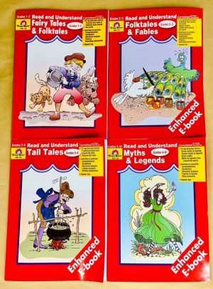 Read And Understand Folktales – (Grade 1 – 6) – Evan Moor.  Đọc & Hiểu, Truyện cổ tích & Truyện dân gian, Lớp 1-2  chứa đầy những sinh vật hoàn toàn giống con người mà sức hấp dẫn đối với độc giả nhỏ tuổi khiến chúng trở thành tâm điểm lý tưởng để học tập và thảo luận. Có truyện ngụ ngôn của người Châu Phi, người Ấn Độ và người Mỹ bản địa.