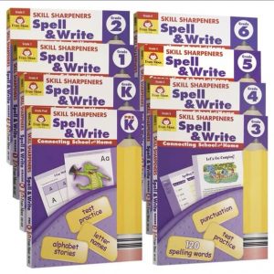 Chẳng hạn quyển Skill Sharpeners Spell & Write GK giúp trẻ mẫu giáo của bạn trở thành một nhà văn tự tin với công cụ mài giũa kỹ năng của Evan-Moor: Đánh vần và Viết.
